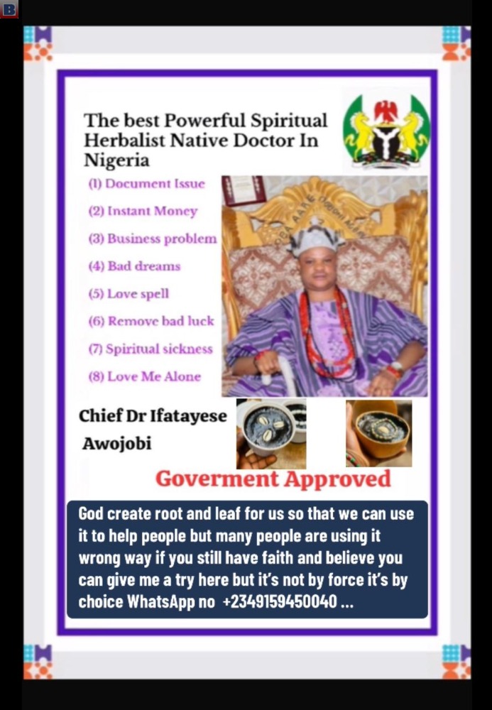am from Nigeria I help people in my country and outside country like Zimbabwe, USA, South Africa, Italy, Libya, German, Northern ghana so many countries friends don't lose your chance bring your problem for solution I promise you I will never regret from meeting IFATAYESE AWOJOBI +2349159450040 I don't need anything from anyone I am here to help serious and interesting people I don't force and I hate lies and I don't promise and if you are facing problem like this 09159450040